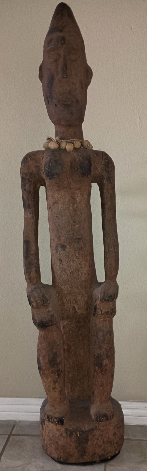 LZZI :Year unknown. Wooden sculpture African tribal shrine figure probably from the Urhobo or Lzzi people of Nigeria. 50" [127cm] tall by 10" [25.4cm] wide