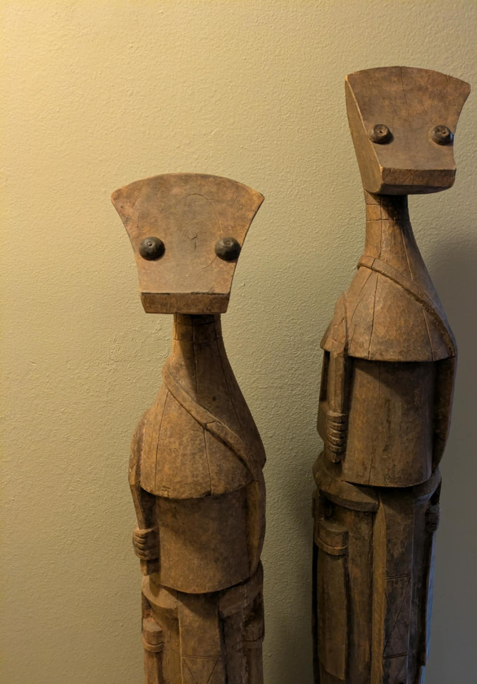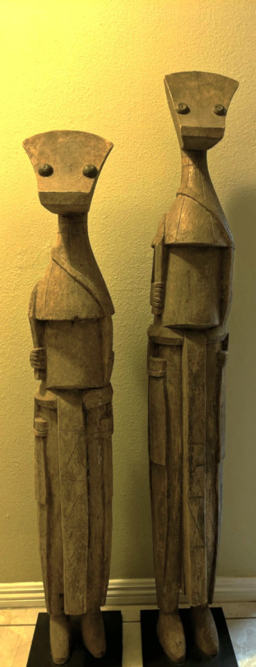 NUFO, the shorter one: Year unknown. Wooden sculpture likely a SENUFO carved kafigueledio figure or a PORO society guardian statue believed to be from the Ivory coast of Africa. A rare matched pair with long swords at their sides. 60" [152.4cm] 54" [137.16]