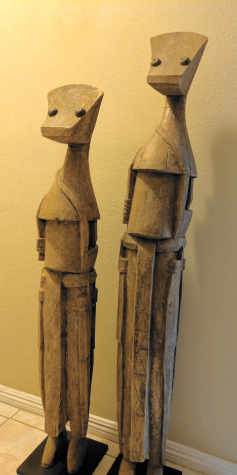 NUFO, the shorter one: Year unknown. Wooden sculpture likely a SENUFO carved kafigueledio figure or a PORO society guardian statue believed to be from the Ivory coast of Africa. A rare matched pair with long swords at their sides. 60" [152.4cm] 54" [137.16]